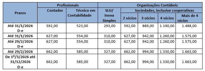 Os Profissionais da Contabilidade e Organizações Contábeis já podem efetuar o pagamento das anuidades devidas ao Conselho Regional de Contabilidade do Pará (CRCPA) para o exercício de 2026. De acordo com a Resolução n.º 1.774, de 13 de novembro de 2025, do Conselho Federal de Contabilidade (CFC), os valores das anuidades serão de: